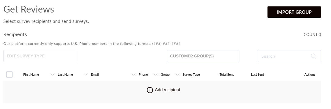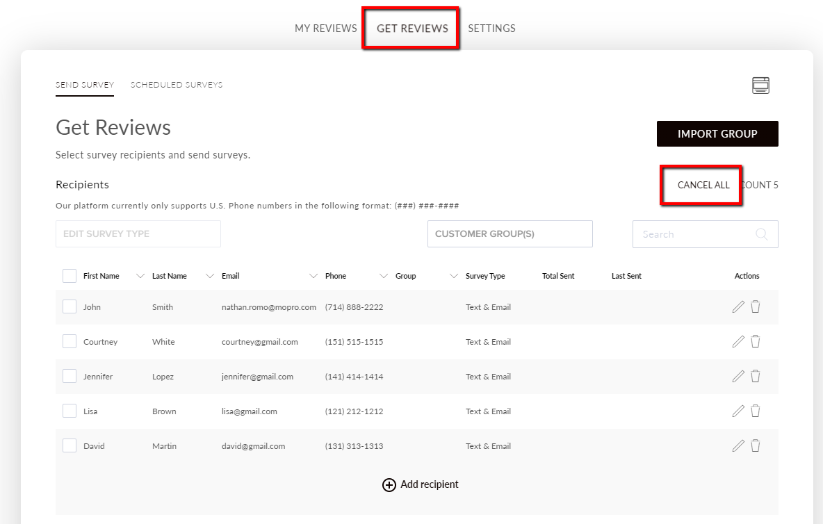 How do I remove all survey recipients from my list? December 06, 2021 19:21 Updated To remove all survey recipients from your list, select the Get 5 Star Reviews tile. Navigate to the Get Reviews tab. Select Cancel All to remove all recipients from your list. Select Yes to confirm. The recipients have now been removed. Related articles How do I share a review on social media? How do I bulk edit survey recipients? Adding a Rotating Banner to Your Website How do I add/edit text on my site? Manage your inbox