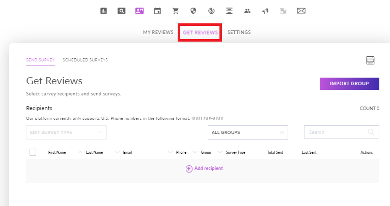 Where do I go in Get 5 Star Reviews to send surveys? December 06, 2021 19:20 Updated 1. To send surveys, select the Get 5 Star Reviews tile. 2. Select the Get Reviews tab. Related articles How do I filter survey recipients on the Get Reviews screen? What is Reputation Manager? What can I do on the Get Reviews tab? How Do I Check My Domain Details? Upgrade MS SQL database
