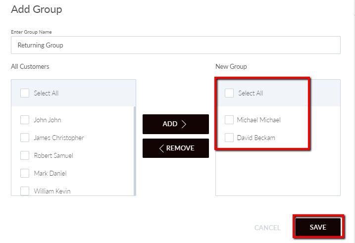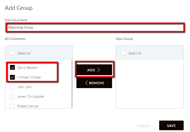 Enter the name of the customer group and select the checkbox next to each customer you would like to add to the group. Select the “Add” button.