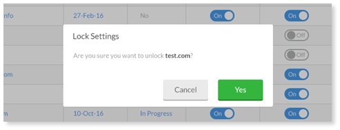 Az egyik domain zárolásához/feloldásához használja a Be/Ki kapcsolót a zárolási beállítások módosításához. Az Igen vagy a Mégse gombra kattintva meg kell erősítenie választását.
