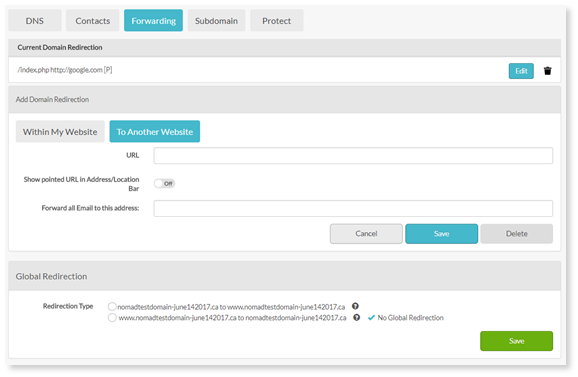 3. A domain továbbításához, valahol a webhelyétől távol, válassza a Másik webhelyrelehetőséget, majd a szükséges adatok megadása után kattintson a Mentés gombra.