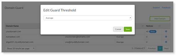 - Védelmi küszöb (szintek): Ha a Domain Guard az Önhöz hasonló tartományt észlel, akkor az alacsony - magas hasonlósági skálán lesz besorolva.