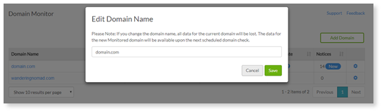 Shënim: Nëse ndryshon emrin e domenit, të gjitha të dhënat për domenin aktual do të humbasin. Të dhënat për domenin e ri të monitoruar do të vihen në dispozicion pas kontrollit të radhës të planifikuar të domenit.